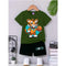 Stylish green t-shirt featuring a cute cartoon tiger playing basketball, paired with comfy black shorts printed with "GOOL". Perfect casual wear for active kids.