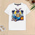 Trendy white kids’ t-shirt featuring a cool bunny in sunglasses and a Lakers #23 jersey, sitting with a basketball and drink. Designed with palm trees and a sunset background, perfect for sporty and stylish looks.